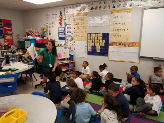 Mrs. Quesnel reading Tooley to her Kindergarten Class